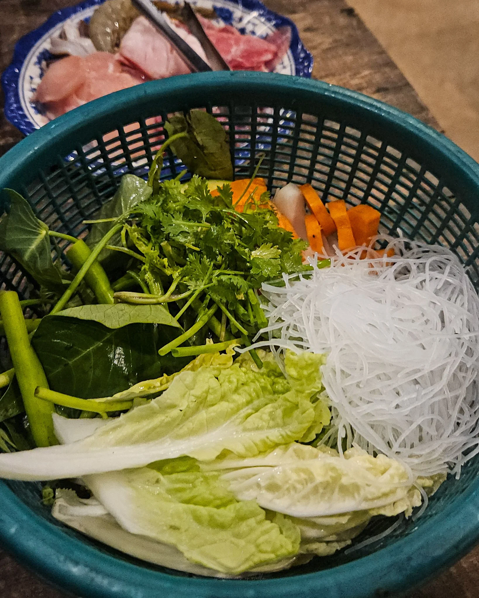 Then out came our delicious feast. The tiny table was filled with plastic baskets full of vegetables and plates of thinly sliced meat, chicken, beef, pork and what we think was buffalo was joined by ribbons of squid and whole prawns. The stock was presented in a plastic juice jug and we were ready to dine!